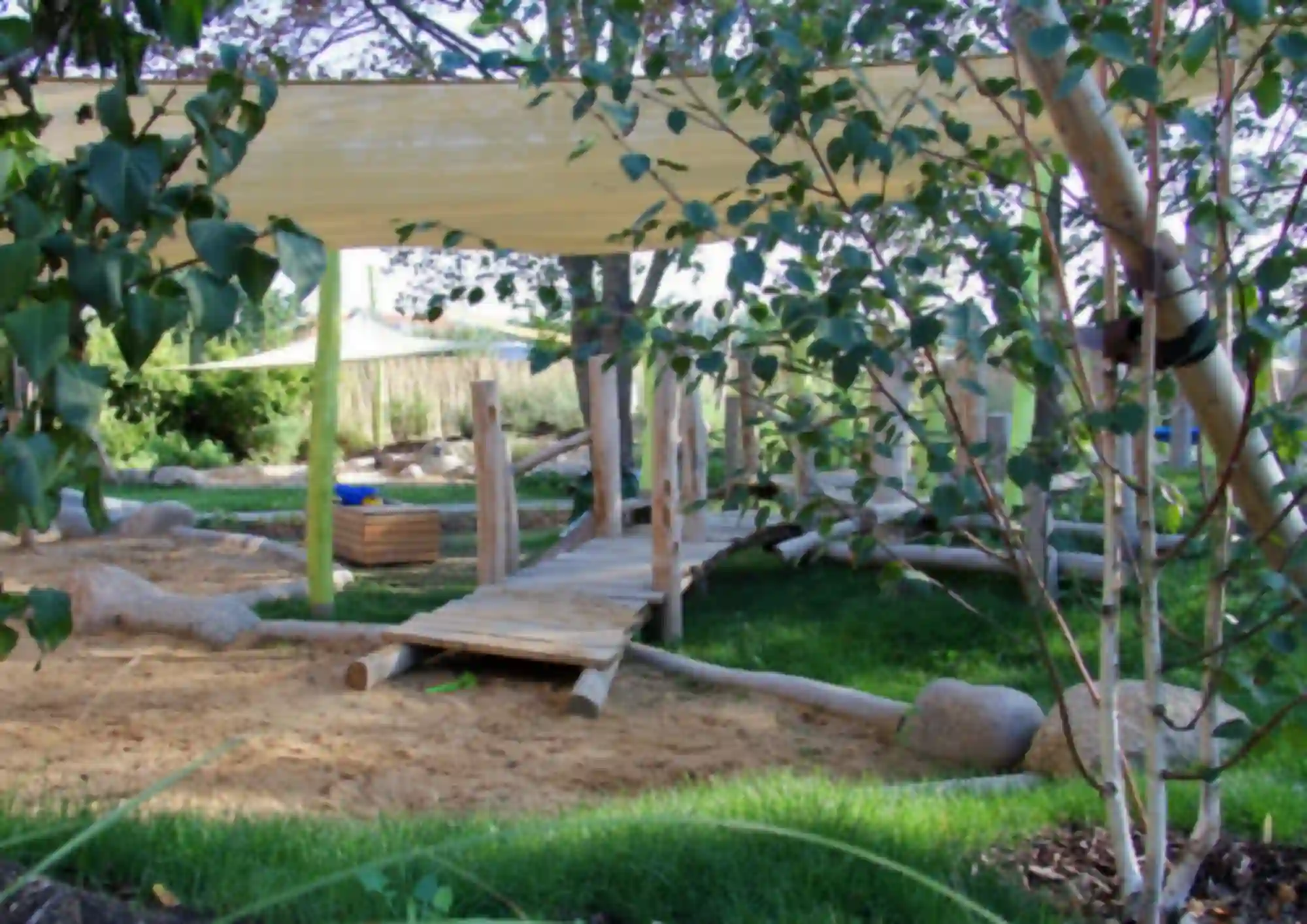 Im Dresdener Stadtteil Trachenberge entstand eine neue Kita ausschließlich für Krippenkinder im Alter von 1-3 Jahren. Dem Wunsch nach einer naturnahen Gestaltung wurde hier gerne entsprochen. So wurde nur ein Mindestmaß an Flächen versiegelt. Kleinere und größere Hügel sowie üppige Strauch- und Staudenpflanzungen gliedern den Garten und bieten schon durch die Modellierung Spielanreize. Durch ein kleines Wettbewerbsverfahren wurde der Spielplatzbauer ausgewählt. Dieser vervollständigt das Bild mit seinen Spielgeräten aus Robinien- und Eichenholz.
