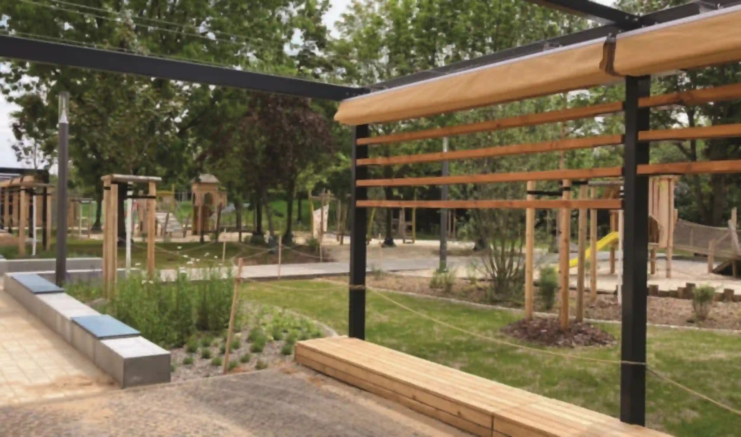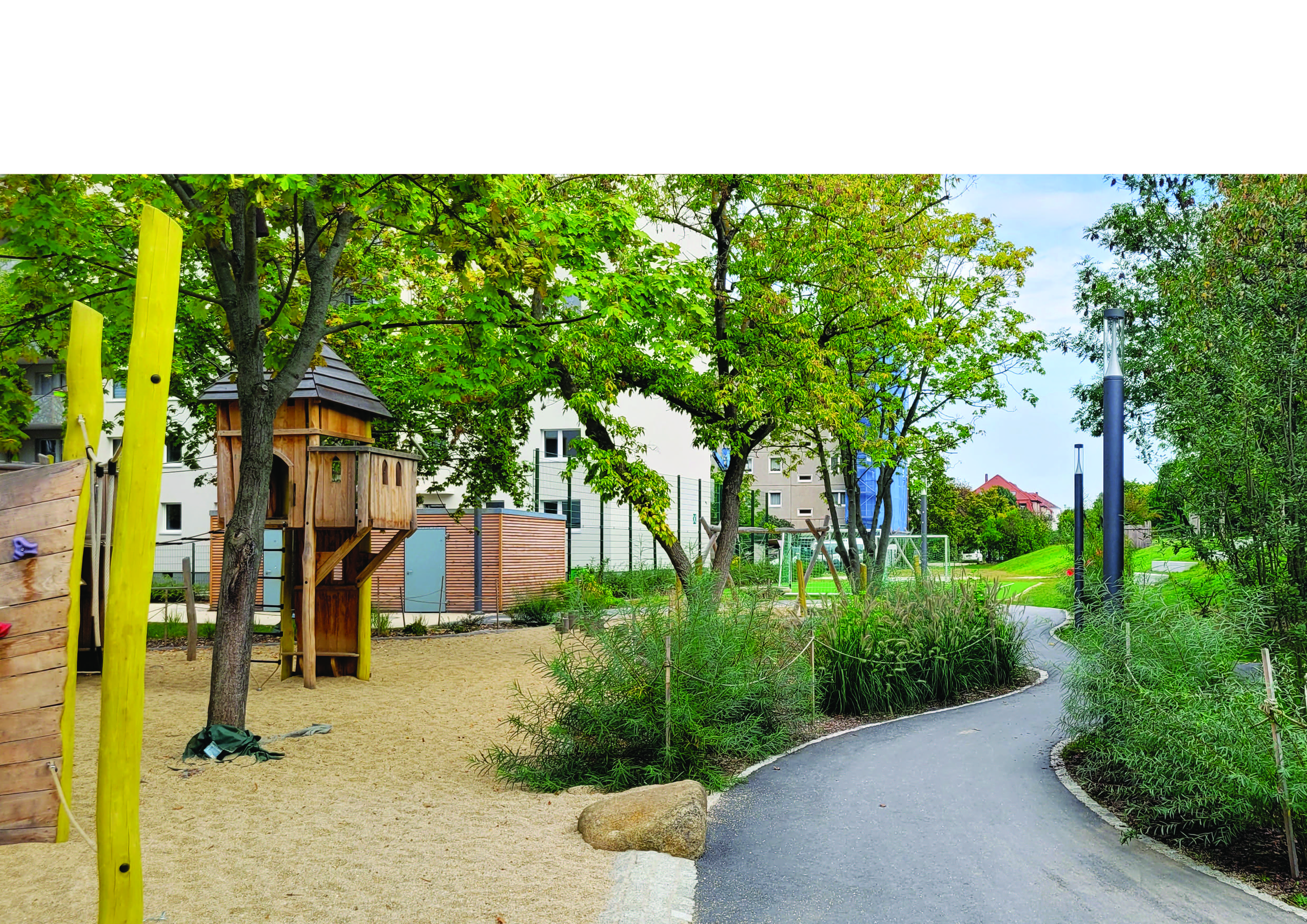 Die Gestaltung des Außengeländes folgt dem Namen der Kita „An der Elbaue“: der Freiraum wird von geschwungenen, fließenden, organischen Formen definiert und erhält damit einen auenartigen, natürlichen Charakter. Eine zentrale Spielfläche aus Kies schlängelt sich durch das Gelände und um die zahlreichen wertvollen Bestandsbäume, umrahmt von einem Rollerweg und begleitet von bespielbaren Streifen aus Gräsern, Weiden und anderen Wildsträuchern. Ein Holzsteg führt als zentrales Element über den Spiel-„Fluss“.