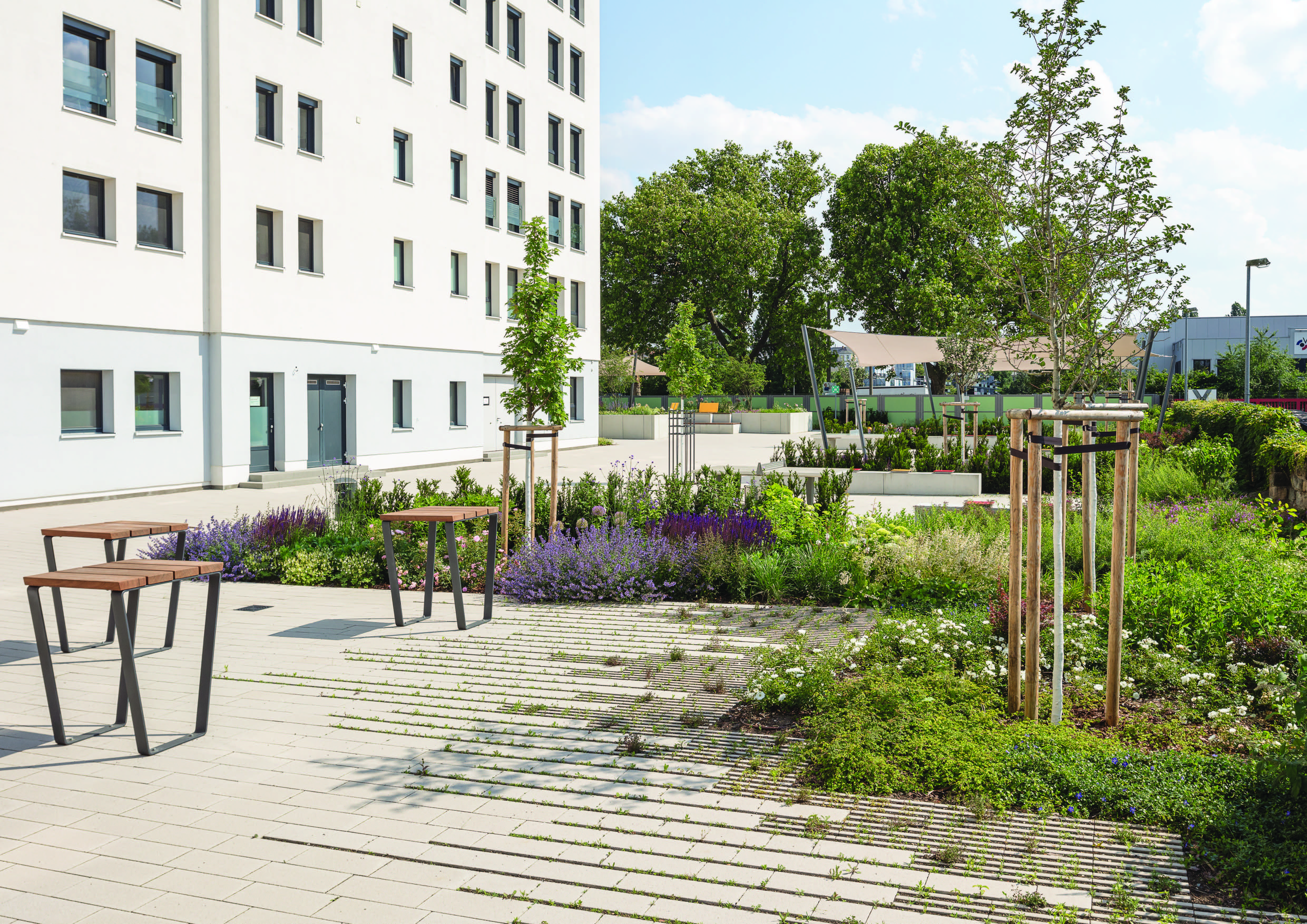 Die neue Gestaltung des ehemals durch Schotterflächen und Großbetonplatten unterschiedlicher Formate geprägten Raumes definiert sich nun durch lineare Strukturen, die die neue Bepflanzung und die Pflasterflächen miteinander verzahnen. Die Grünflächen schieben sich in schmalen Streifen und grünen Fugen in die Pflasterflächen und schaffen Räume, unterstützt von perspektivisch schattenspendenden Bäumen. Lineare Sitzmauern mit einzelnen Bankauflagen ordnen sich entlang dieser Strukturen an und betonen diese. Dadurch entstehen attraktive Aufenthaltsbereiche, die sowohl zum Entspannen als auch zum Bewegen einladen. Neben dem Cafeteria-Bereich gibt es Tischtennisplatten, Bewegungselemente, ein Basketballfeld und ein grünes Klassenzimmer mit gestaffelten Sitzreihen.