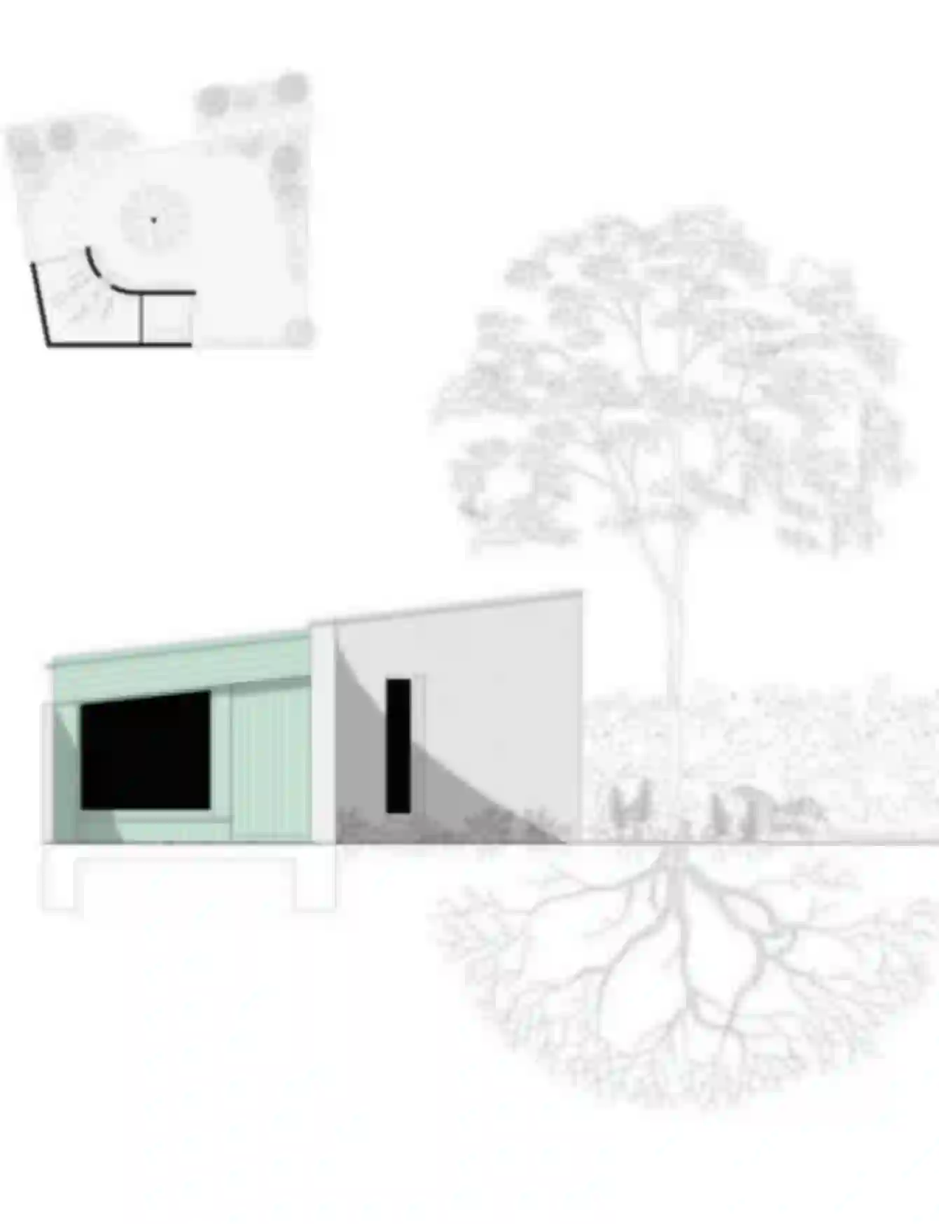 Aus dem anfänglichen Auftrag des Bauherrn für eine „Garage“ wurde ein kleiner Stadtbaustein – ein Gartenhaus. Das Haus schmiegt sich in die Raumecke des Garten, lässt dem Garten somit möglichst viel Raum und schützt gleichzeitig den Wurzelraum des Baumes.