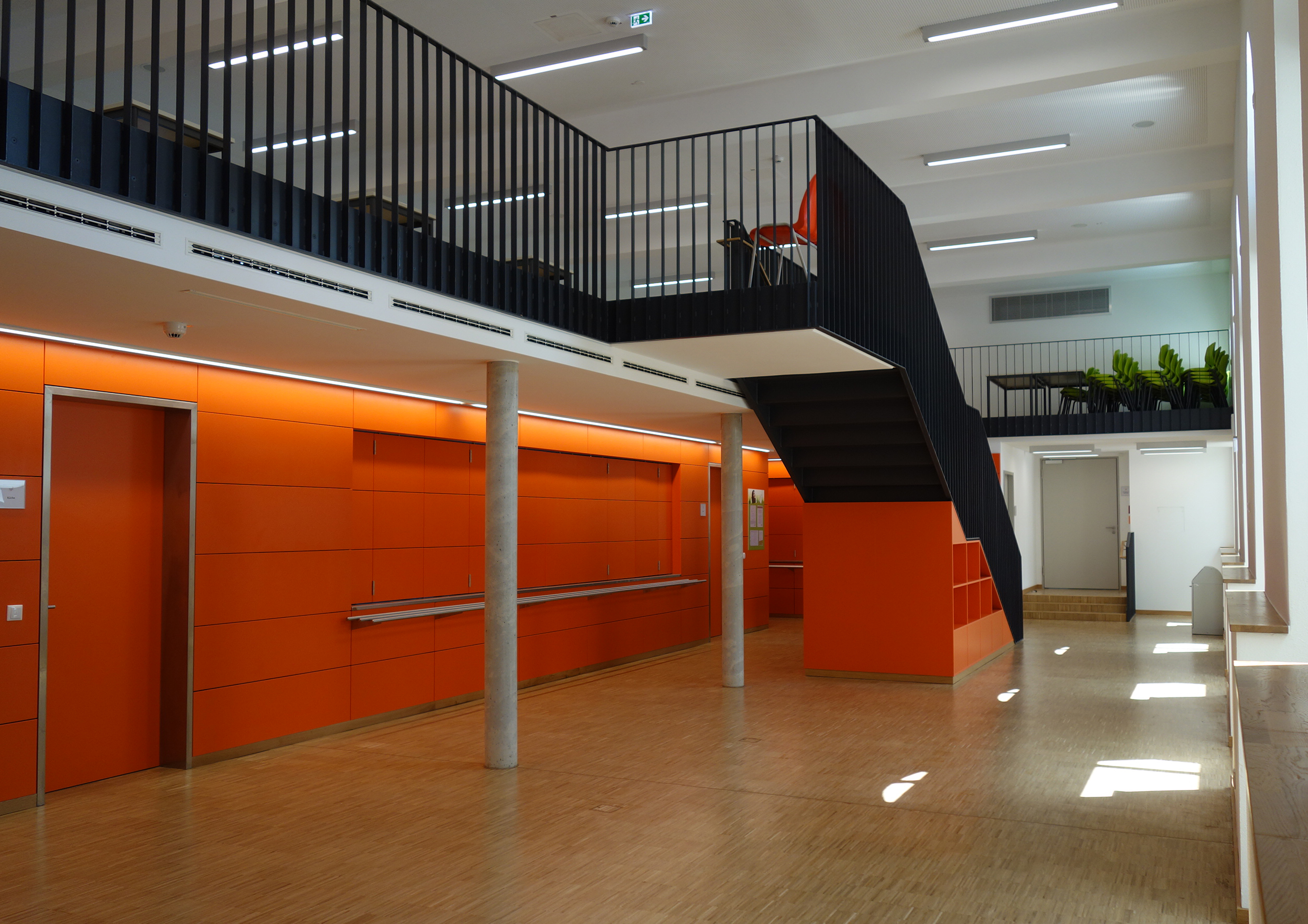 Die alte denkmalgeschützte 2-geschossige Turnhalle des Gymnasium Cotta wurde zu Aula und Mensa umgenutzt. Um den Platzbedarf für die Mensa zu decken, wurde in der unteren Turnhalle eine Galerie eingebaut und die Sporthalle zur Südseite geöffnet und die Fläche nach außen in einem Anbau erweitert. In der oberen Turnhalle wurde die Aula eingeordnet. Der historische Dachstuhl bleibt sichtbar und erlebbar.