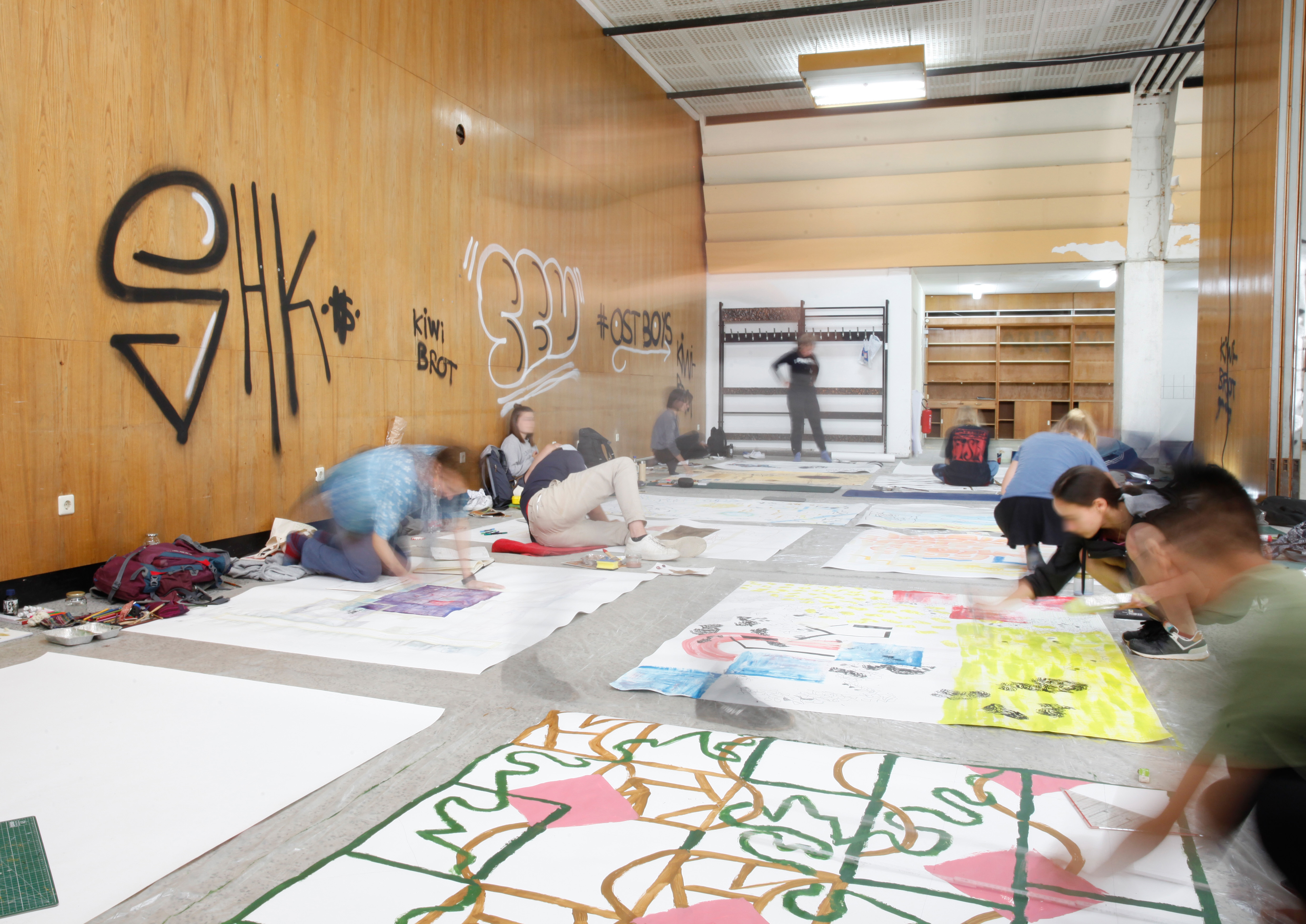 "Raum - Bewegung - Notation" war ein experimentelles künstlerisches Seminar für Studierende der Landschafts-/Architektur, TU Dresden, Sommersemester 2022: Wie beeinflusst Raum Bewegung und umgekehrt? Wie kann man dies körperlich erfahren und erinnern? In Zusammenarbeit mit Choreografin Jana Schmück erforschten Studierende verschiedene Orte im Innen- und Außenraum der Robotron-Kantine Dresden in Bewegung. Die individuellen und kollektiven Erfahrungen notierten sie grafisch frei auf großem Format. Mit einer aus Bewegungsmotiven zusammengestellten Choreografie führten sie Besucher durch das Gebäude und regten eigene Raumerfahrungen an.