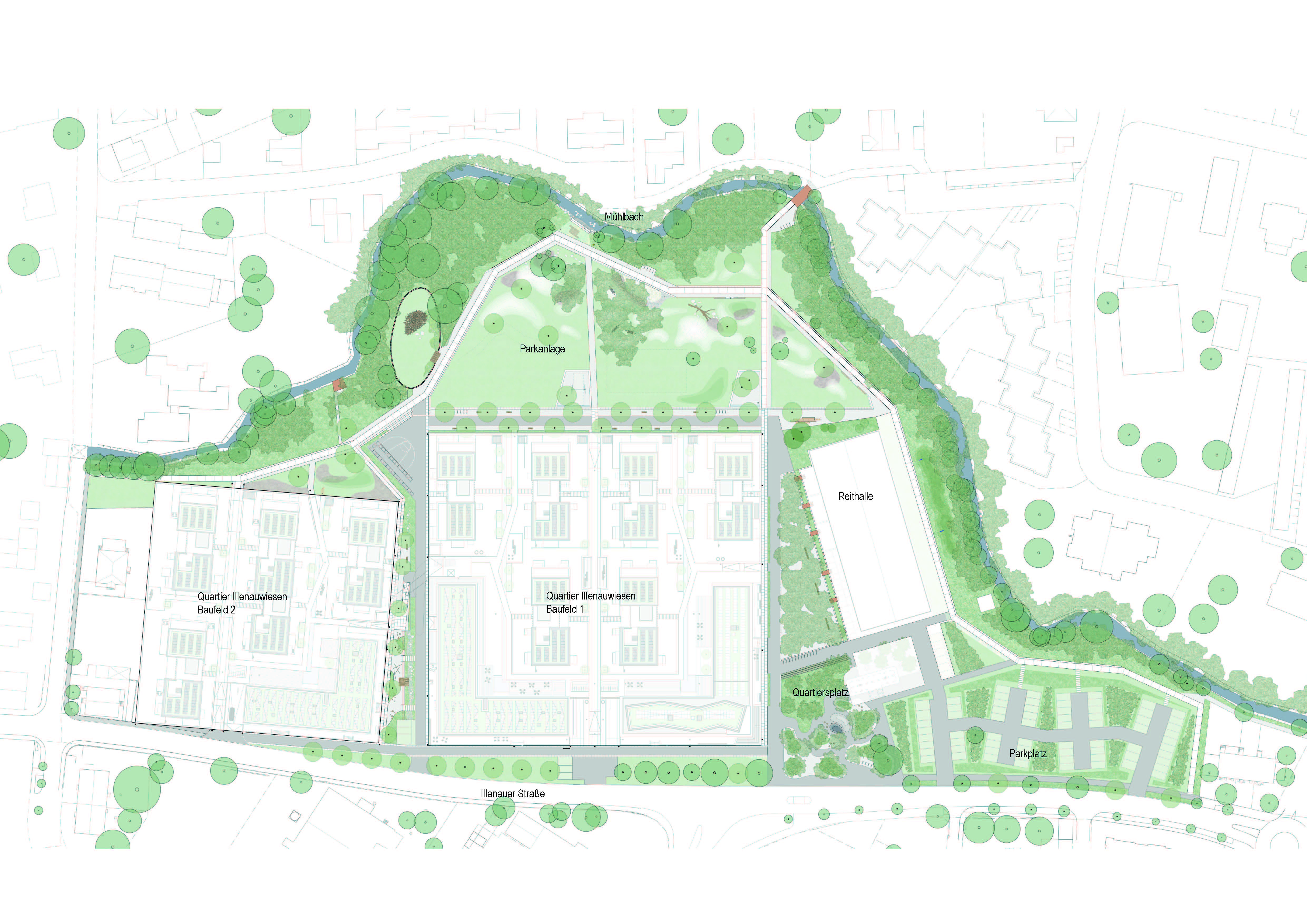 Die Planung umfasste den gesamten Prozess – vom interdisziplinären städtebaulichen und freiraumplanerischen Wettbewerb über die Erstellung der Rahmen- und Bebauungsplanung bis hin zur Ausführung der Objektplanung für die Freianlagen. Im Rahmen der städtebaulichen Eingliederung eines ehemaligen Konversionsgeländes wurde sichergestellt, dass alle anfallenden Erdmassen vor Ort verbleiben. Ein robustes Wegenetz und neue Plätze verknüpfen das Areal mit dem Stadtgebiet von Achern. Standortgerechte Pflanzungen neuer Vegetationstypen – wie die Stärkung des Auwaldes, die Etablierung von Hochstaudenfluren und Wiesenansaaten – fördern die Artenvielfalt und wirken klimapositiv. Im Rahmen des Schwammstadtprinzips verbleibt sämtliches Regenwasser vor Ort, wird genutzt, versickert und erlebbar gemacht. Die Illenauwiesen in Achern bieten somit der Stadtgesellschaft eine inklusive, lebendige Bühne als neuer, grüner Stadtbaustein. Konversionsgeländes wurde sichergestellt, dass alle anfallenden Erdmassen vor Ort verbleiben. Ein robustes Wegenetz und neue Plätze verknüpfen das Areal mit dem Stadtgebiet von Achern. Standortgerechte Pflanzungen neuer Vegetationstypen – wie die Stärkung des Auwaldes, die Etablierung von Hochstaudenfluren und Wiesenansaaten – fördern die Artenvielfalt und wirken klimapositiv. Im Rahmen des Schwammstadtprinzips verbleibt sämtliches Regenwasser vor Ort, wird genutzt, versickert und erlebbar gemacht. Die Illenauwiesen in Achern bieten somit der Stadtgesellschaft eine inklusive, lebendige Bühne als neuer, grüner Stadtbaustein.