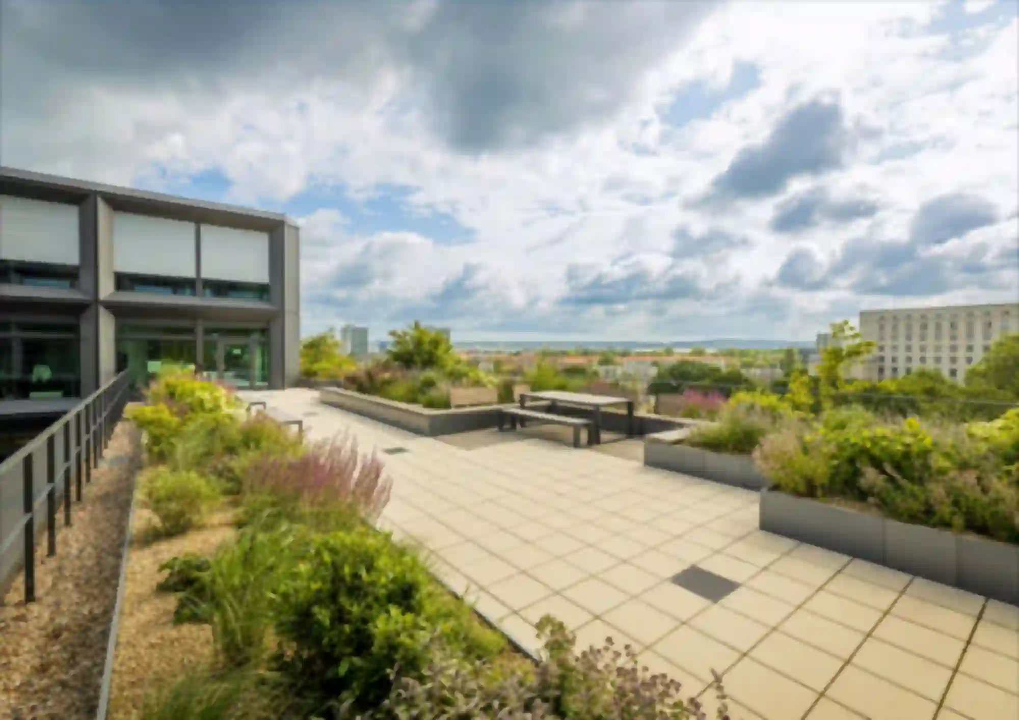Die Außenanlagen im EG sowie im 5. und 6.OG wurden mit dem Ziel geplant, statt einer monotonen Bepflanzung ein üppiges, blühendes, duftendes und in den Dachgärten für die Mitarbeitenden sogar schmackhaftes Grün zu schaffen. Entstanden ist ein außergewöhnlicher Ort mit Blick über das Stadtgebiet, ein inspirierender Aufenthaltsraum im Freien mit einer harmonischen Verbindung von Natur und Funktionalität, welcher von vielen Mitarbeitenden zur Pause oder zum Arbeiten genutzt wird.
