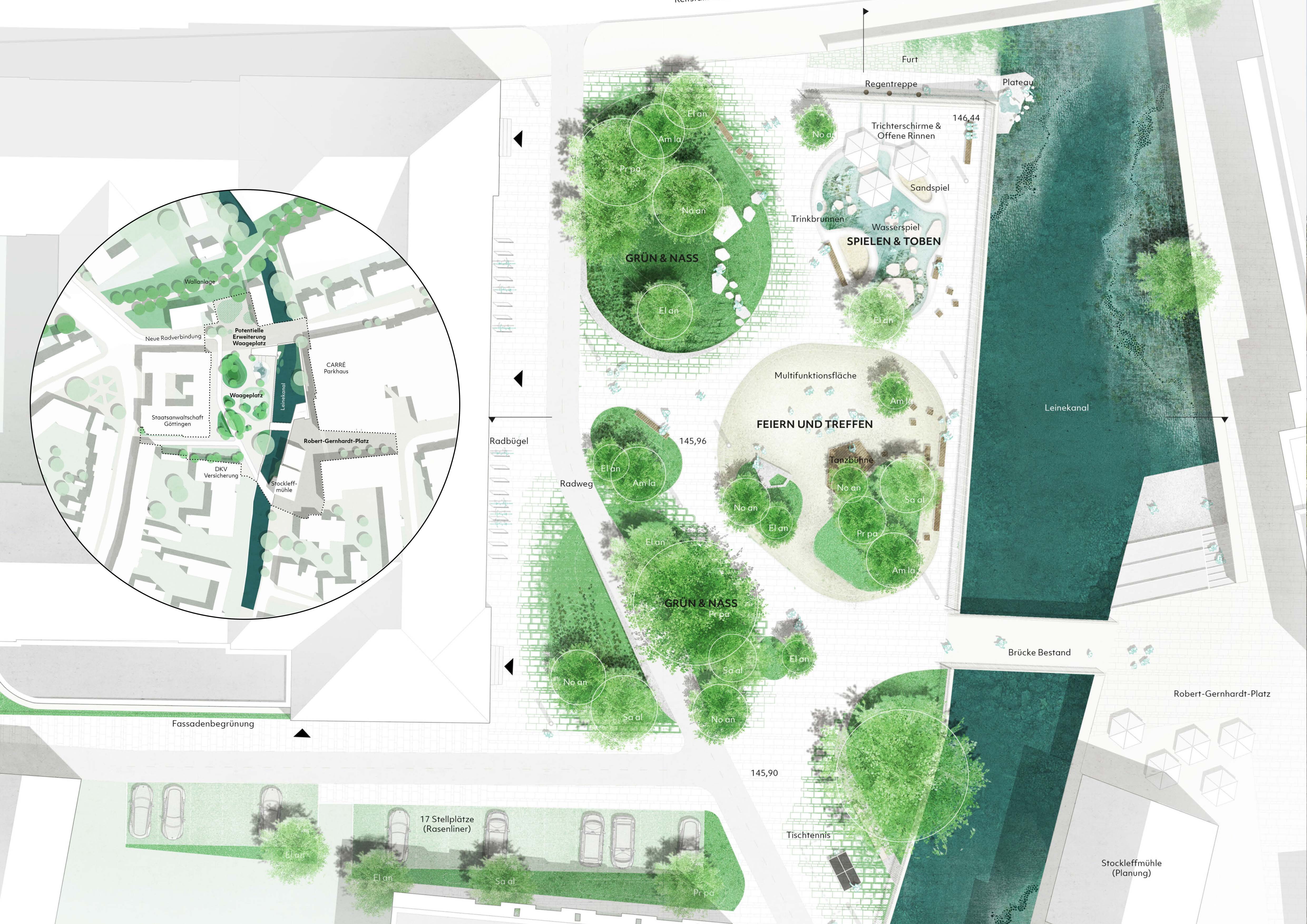 Der Waageplatz bildet eine zentrale Verbindung zwischen der Göttinger Innenstadt und dem Masch-Straßen-Viertel. Direkt am Leinekanal gelegen, grenzt er an die Staatsanwaltschaft sowie an die grünen, denkmalgeschützten Wallanlagen der Stadt. Ziel des aktuellen Konzepts ist es, den Waageplatz in eine hybride Plattform zu transformieren, die städtische Nutzungen und Erholungsfunktionen miteinander vereint. Dabei soll der Platz sowohl Raum für Aufenthalt und Spiel als auch für Mobilität und ökologische Grünflächen bieten. Ein durchgängiges Gestaltungskonzept und eine differenzierte Materialwahl sorgen für eine klare räumliche Struktur. Offen gestaltete Muldenflächen werden als wichtige Elemente des nachhaltigen Regenwassermanagements integriert. Dadurch entsteht kein klassischer Stadtplatz, sondern ein multifunktionaler Hybrid mit hoher ökologischer und klimapositiver Wertigkeit. Das Projekt befindet sich aktuell in Leistungsphase 5, nachdem es im Jahr 2023 im freiraumplanerischen Realisierungswettbewerb mit dem 1.Preis ausgezeichnet wurde.