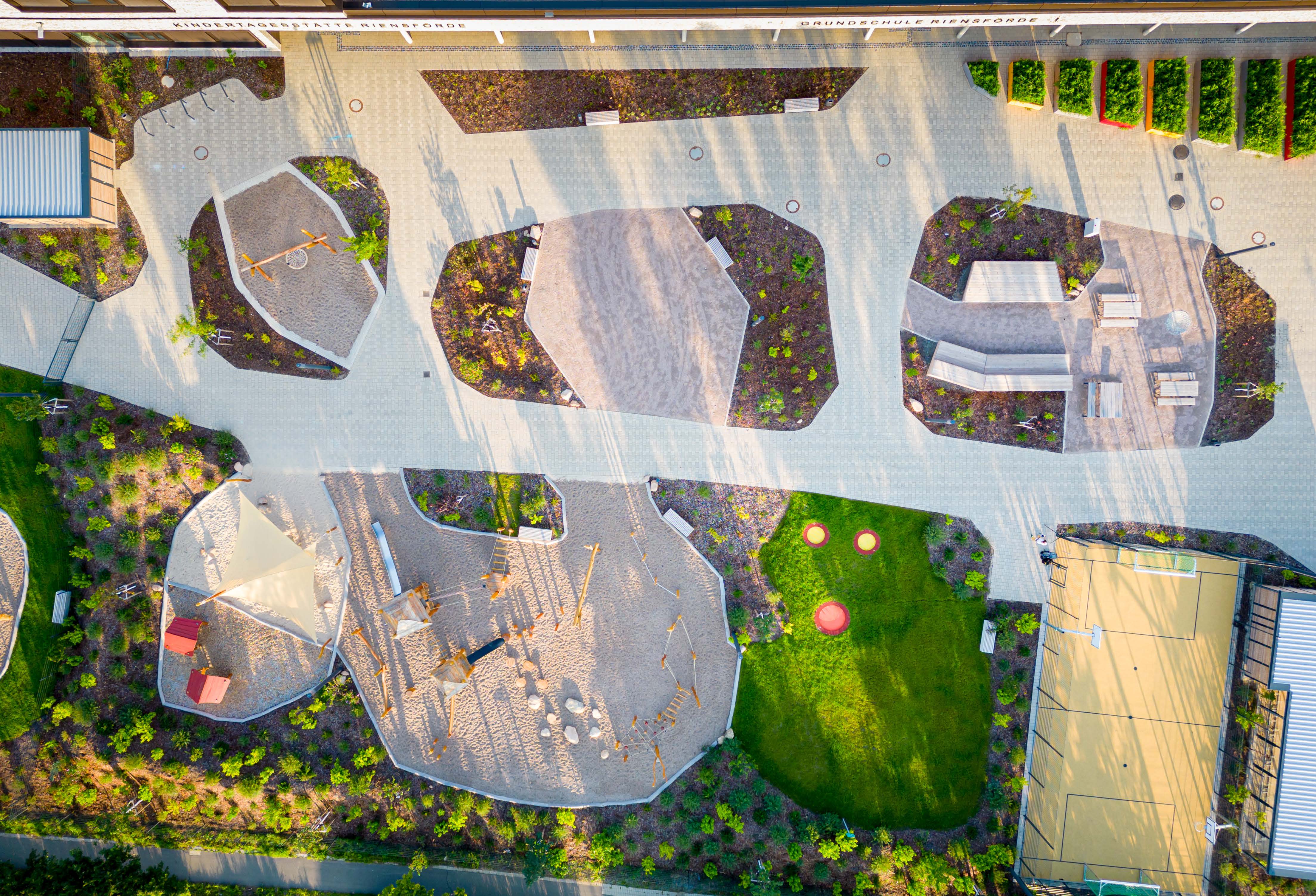 Das Wort Campus, im lateinischen „Feld“, passt in diesem Projekt im doppelten Sinne. Auf den ehemals landwirtschaftlich genutzten Feldern wurde ein Feld der Bildung für ca. 1000 Kinder und Jugendliche geschaffen: Oberschule, Kita/Grundschule und Sporthalle. „Inseln“ gliedern die Areale und beinhalten verschiedene an die jeweilige Altersklasse angepasste Angebote für Bewegung, Spiel und Aufenthalt. Gerahmt werden diese Inseln von üppigen Baum- und Strauchpflanzungen. Dadurch ergibt sich in der Gesamtheit ein aufgelockertes naturnahes Bild. Durch die kleinzonierten Freiräume werden die Anlagen den großen Schüler- und Kinderzahlen gerecht. Mit dieser Gestaltung konnte sowohl ein ästhetischer als auch nachhaltiger, funktionaler Außenraum geschaffen werden.