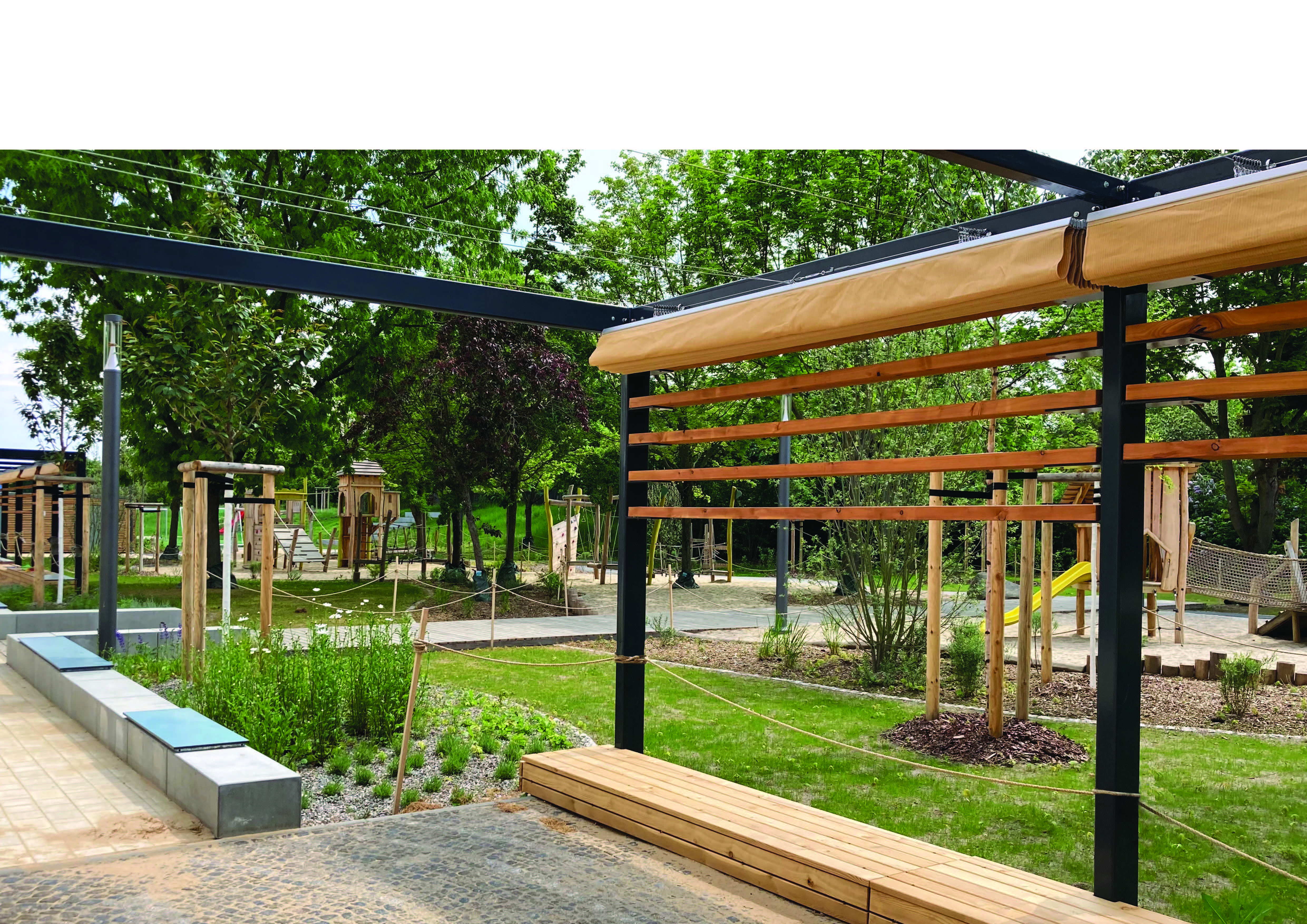 Die Gestaltung des Außengeländes folgt dem Namen der Kita „An der Elbaue“: der Freiraum wird von geschwungenen, fließenden, organischen Formen definiert und erhält damit einen auenartigen, natürlichen Charakter. Eine zentrale Spielfläche aus Kies schlängelt sich durch das Gelände und um die zahlreichen wertvollen Bestandsbäume, umrahmt von einem Rollerweg und begleitet von bespielbaren Streifen aus Gräsern, Weiden und anderen Wildsträuchern. Ein Holzsteg führt als zentrales Element über den Spiel-„Fluss“.