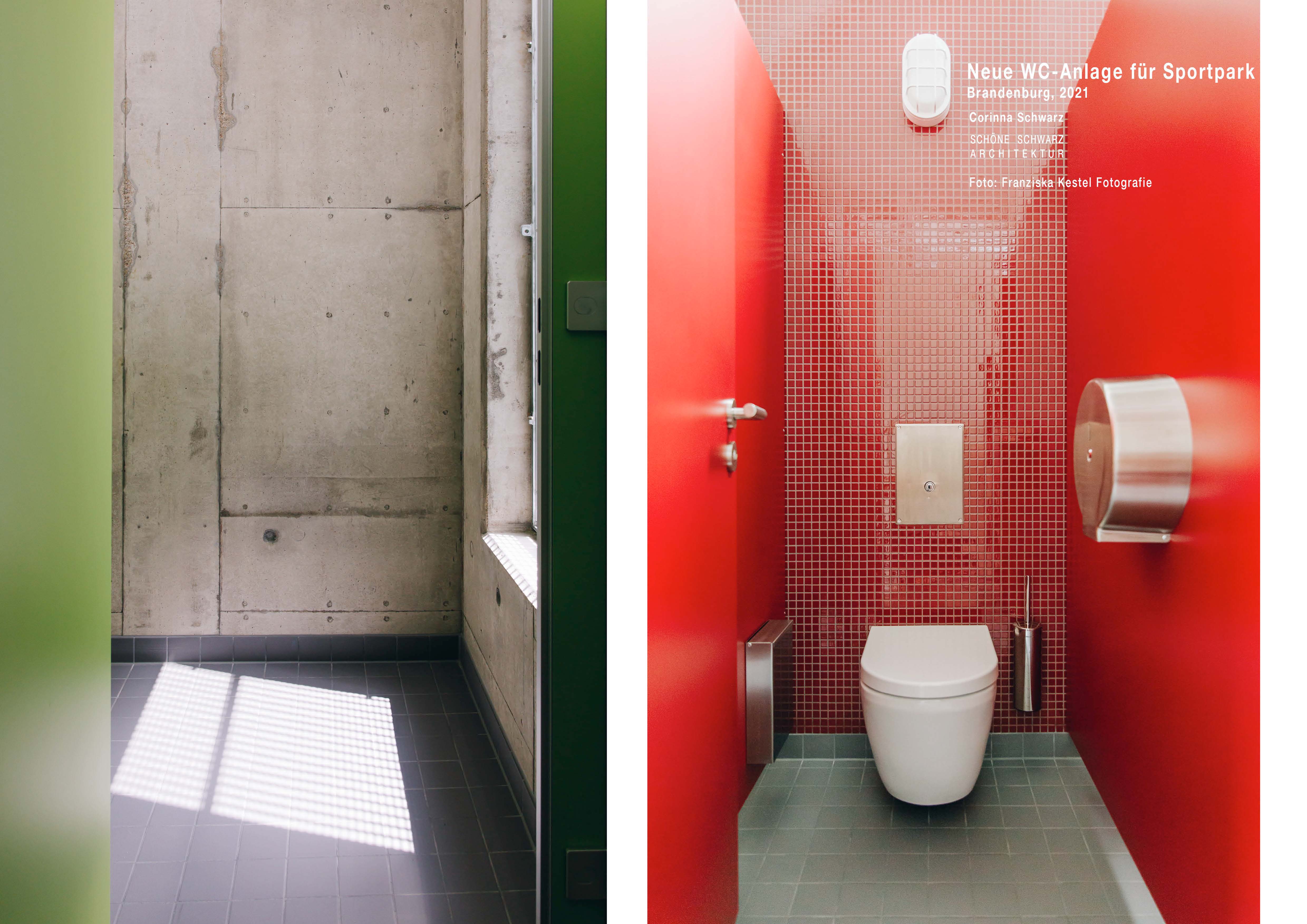 Um der Nutzung von Stadion, Kunstrasenplatz und Skatepark gerecht zu werden, wurde durch die Stadt Finsterwalde der Neubau einer WC-Anlage realisiert, die alle drei Bereiche bedient. Der silberfarbene Neubau aus Ortbeton mit passend grauem Blechdach, ist durch sein hohes Zeltdach in der gesamten Sportanlagenlandschaft gut sichtbar und sticht aus der grünen Umgebung hervor. Die Gitterrostfassade schütz den öffentlichen Baukörper und die daran angeschlossene Zaunanlage trennt den halböffentlichen vom öffentlichen Bereich. Der Baukörper wurde als untergeordnetes Pendant zum östlich gelegenen Tribünengebäude positioniert. Die Farbgebung der symmetrisch angeordneten Innenräume der Damen- und Herren-WCs nimmt den Farbkontrast auf, der den Sportbereich dominiert. Aschebahn und Fußballrasen. ROT & GRÜN. Die beiden monochromen Farbräume finden dann in der öffentlichen Unisex-Toilette zueinander.