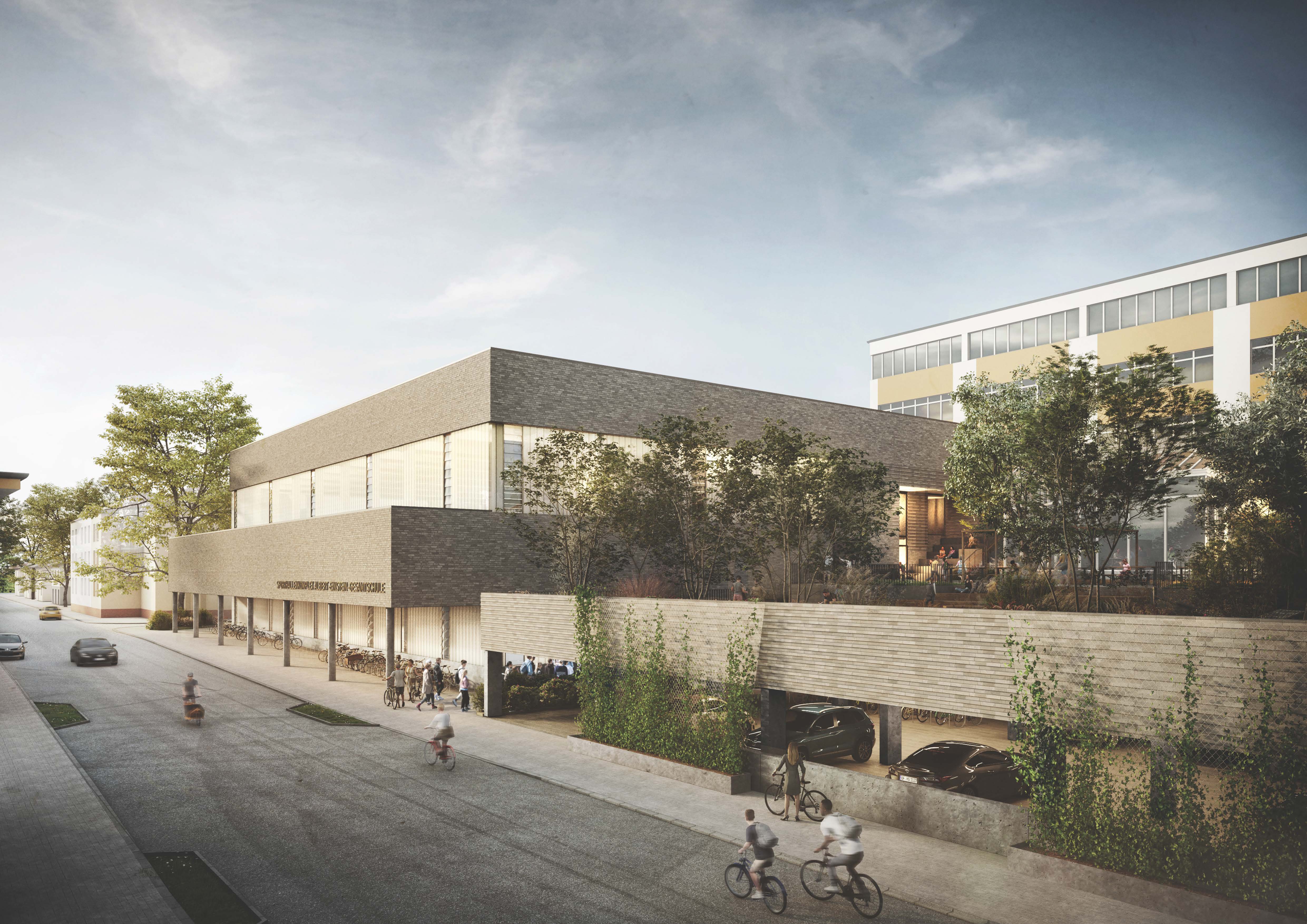Der Schulhof einer Gesamtschule in Remscheid sollte umgestaltet werden. Die besondere Herausforderung war, dass etwa die Hälfte des Schulhofs als Dachbegrünung auf einer Parkpalette ausgestaltet wurde. Eine Vorgabe war, dass 80% der Verschattung durch Bäume gewährleistet werden sollte. Dadurch entstand im Entwurf ein stark durchgrünter, wilder Schulhof, der fast vollständig von einem Blätterdach bedeckt ist.