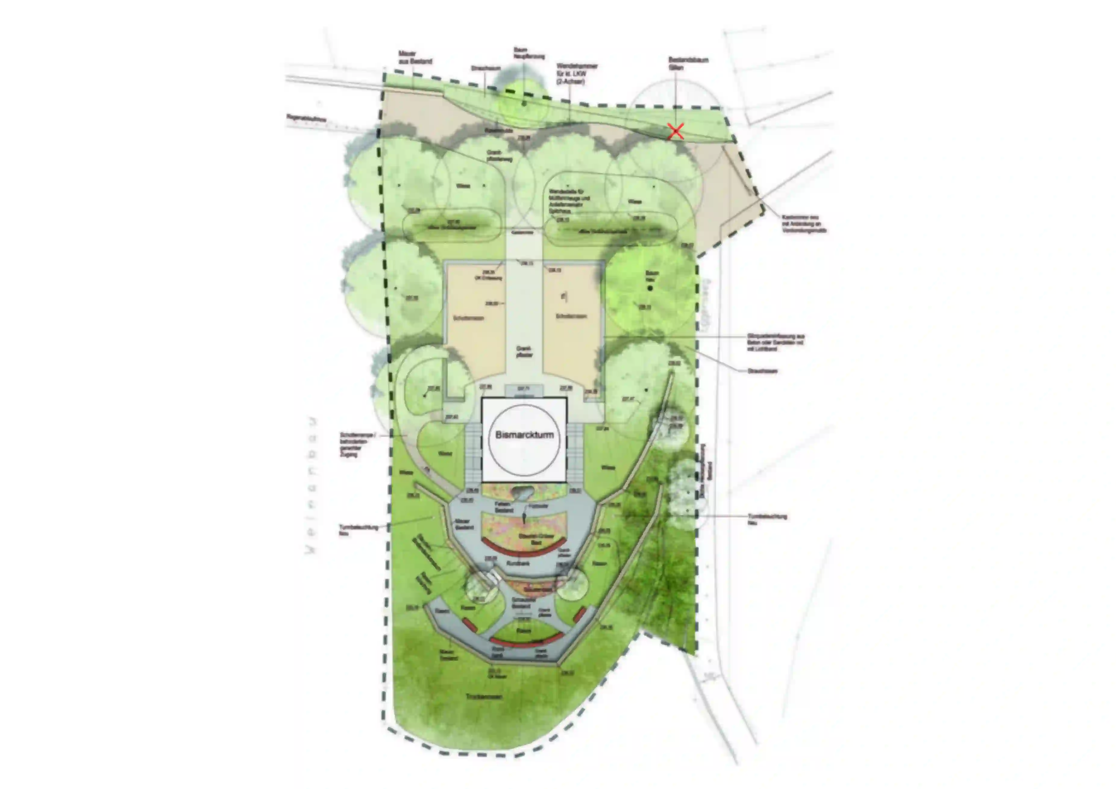 Die Außenanlagen des 1907 erbauten Bismarckturms in Radebeul waren bis zur Umgestaltung 2023 sehr einfach hergestellt. Ziel nach der Sanierung des Turmes war es, diese ansprechend, unter Berücksichtigung des hohen Nutzdruckes neu zu gestalten, sich dabei dem dominierenden Turm unterzuordnen und sich an der historischen Absicht und Substanz zu orientieren. Neben der Integration der vorhanden Natursteinmauern sind hangseitig neue Pflanzbeete mit Bienenweidenpflanzen und zahlreichen Sitzgelegenheiten geschaffen wurden. Auf der hangabgewandten Seite rahmt ein Sandsteincarré mit Lichtband den Platz. Außerdem musste in diesem Bereich eine Staumöglichkeit für ankommendes Oberflächenwasser geschaffen werden.