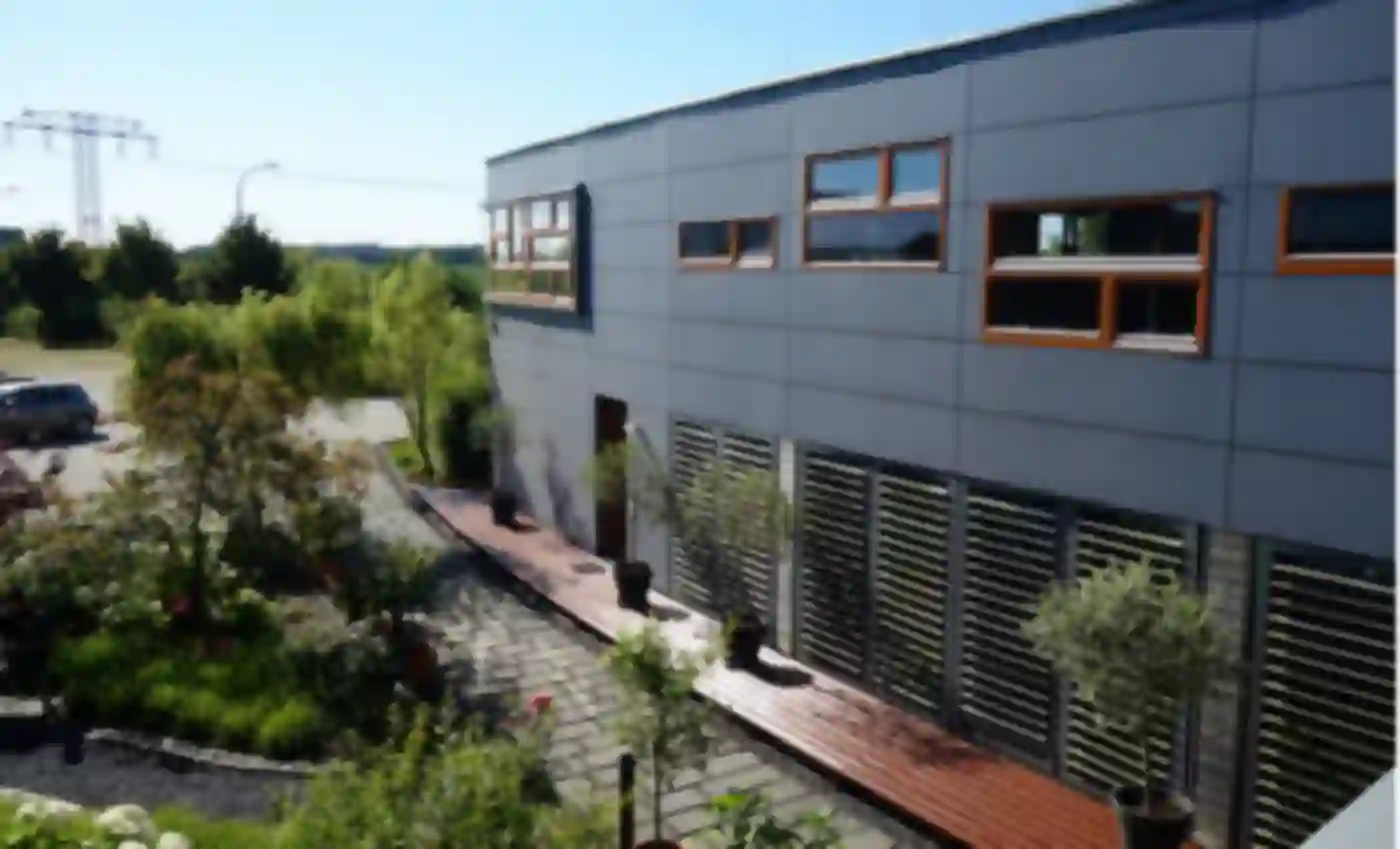 Entwurf und Planung einer Produktionsstätte mit Bürogebäude und Lagerhallen, für kreativen Messebau und innovative Tischlerei. Von der Konzeption bis zur Produktion und Montage. Das Bürogebäude 1200 m² als Zweispänner in Stahlbetonskelettbau konzipiert, kontrastiert im Innern mit Sichtbetonwänden und Holzausbauten. Die lichtdurchflutete Produktionshalle mit 3600 m² zeichnet sich durch 38 m lange Parallam-Fachwerkträger aus, die über mittige Stützen abgefangen werden. 4000 m² Lagerhallen dienen der Aufbewahrung kundeneigener Messestände. Uns war wichtig dieses Ensemble mit warmen Holzfassaden (Produktion und Lagerung) zu bekleiden, damit sich das Bauwerk von der Architektur herkömmlicher Gewerbebauten unterscheidet, und sich in die umliegende hügelige Landschaft einfügt.