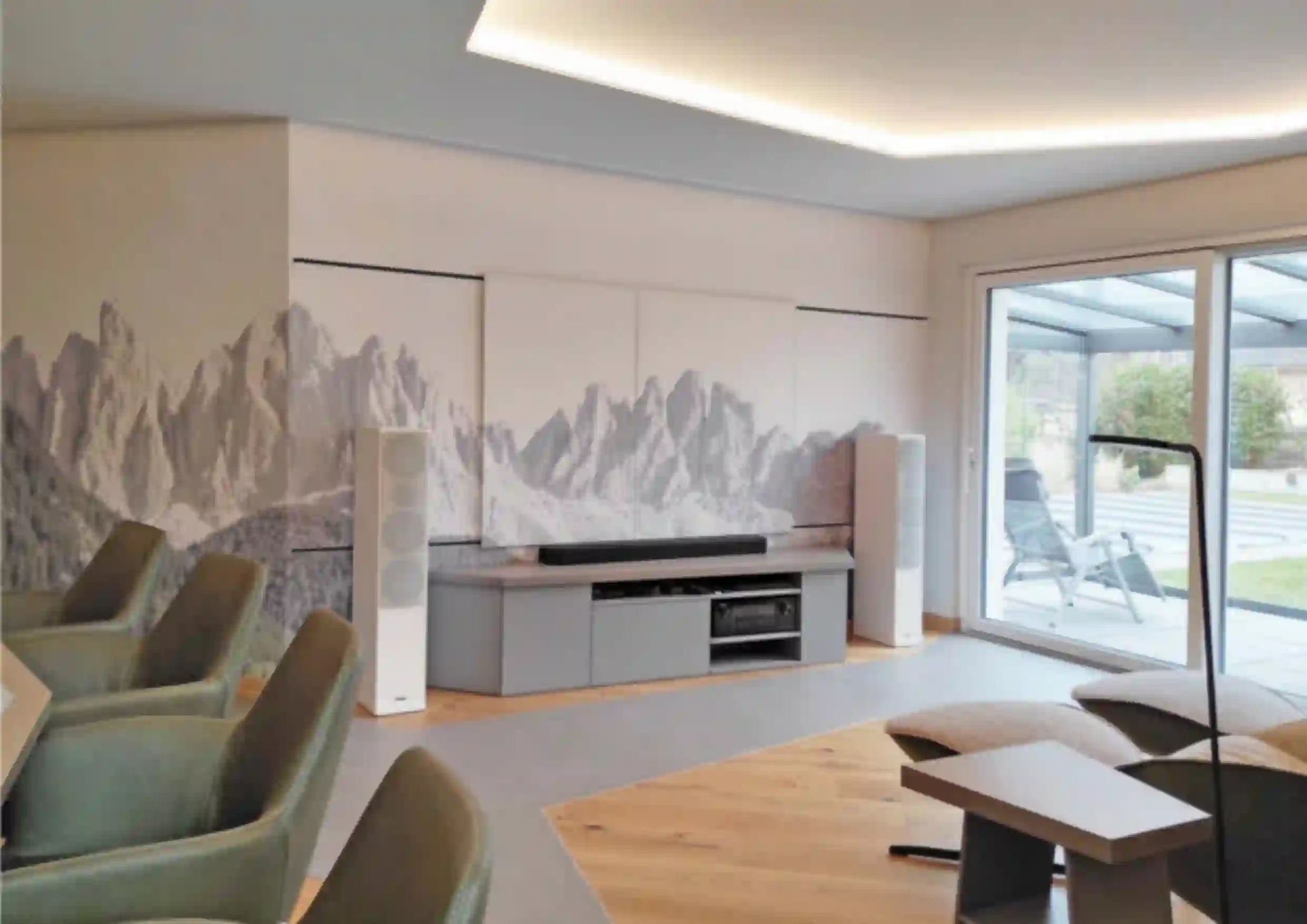 Im Wohnraum entstand eine freie, asymmetrische und eckige Form bei der Gestaltung des Deckenlichts und der Möbel. Alle Möbel, insbesondere der große Eichentisch und die Leuchte (angefertigt von der Tischlerei Engelstädter), wurden eigens entworfen. Der Boden zeigt einen Wechsel zwischen gespachtelten Wegen und Parkettschollen. Zudem wurde eine neue Fußbodenheizung installiert. Der Fernseher wurde durch Blenden eingefasst, die mit einemgroßformatigen Wandmotiv der Lieblingsberge der Auftraggeber:innen gestaltet sind.