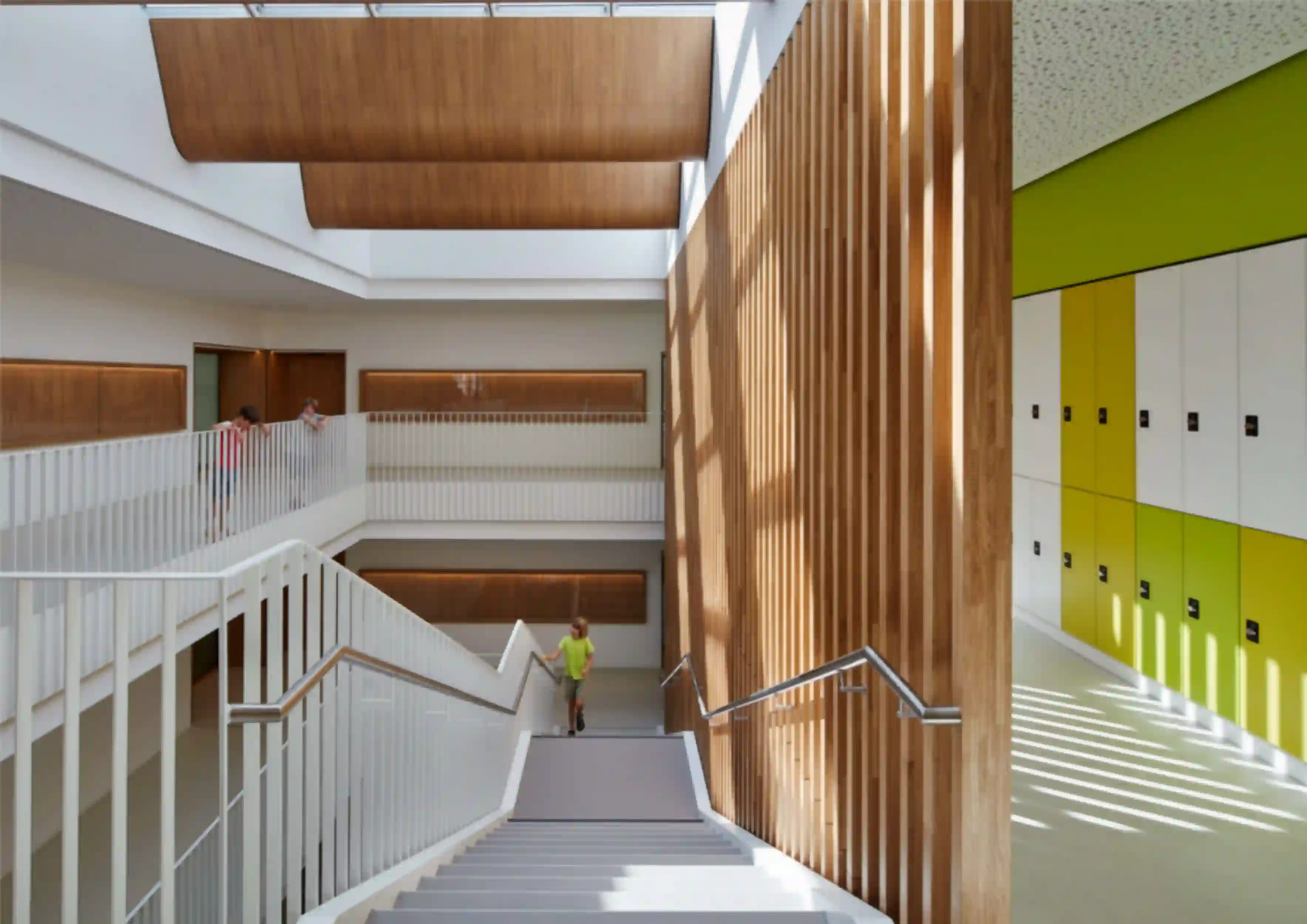 Das Bauvorhaben besteht aus dem Neubau des Schulgebäudes, dem Neubau der 1-Feldsporthalle sowie der Sanierung und Erweiterung der denkmalgeschützten Bestandssporthalle. Die Sporthallen sind mit einem gemeinschaftlichen Eingangs- und Sanitärtrakt miteinander verbunden.