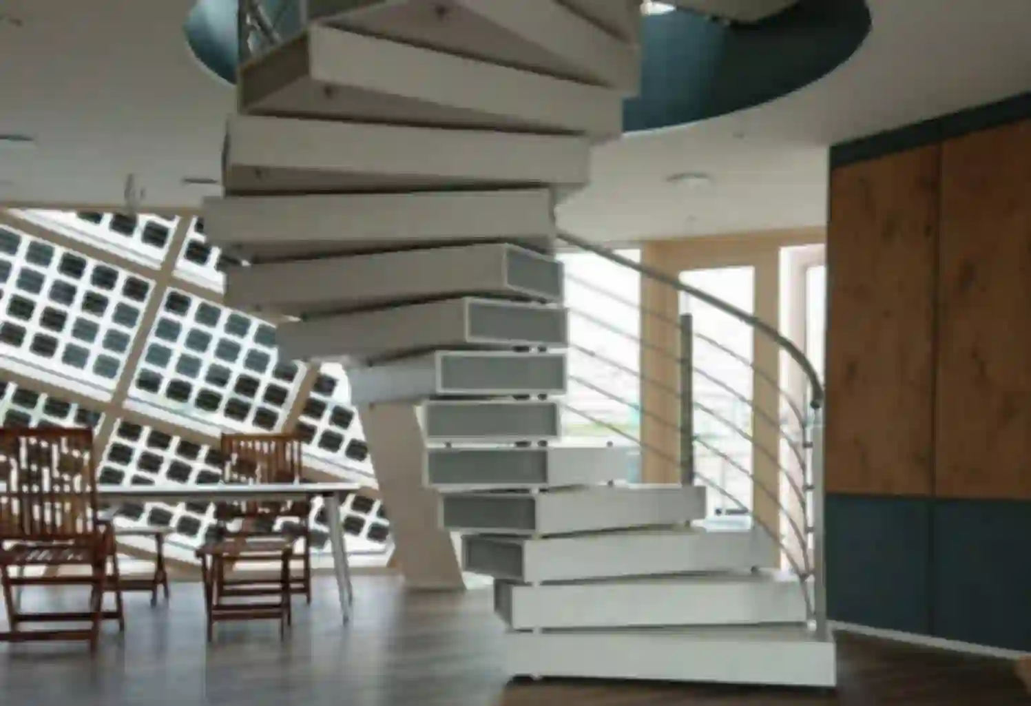 Die Form des schwimmenden Gebäudes wird durch das Ineinanderfügen dreier Würfel gebildet, von denen jeder optimal auf eine Hauptfunktion der autarken Gebäudeversorgung abgestimmt ist. Zwei dieser Würfel sind zur maximalen Energiegewinnung aus der Senkrechten gekippt. Dabei wird auf der 30° nach Süden geneigten Dachfläche des stegseitigen Würfels „Thermocube“ im Sommer ausreichend Wärme über Solarthermiemodule gewonnen und auf den 70°-geneigten Süd- und Westfassaden des „Powercube“ auch an Wintertagen genügend Strom über Photovoltaikzellen. Der zum Hafenbecken zeigende Würfel „Aquacube“ stellt mit Terrasse und raumgroßen verglasten Schiebetüren auf Deckhöhe die direkte Verbindung zum Wasser her. Hier wird Grauwasser biologie- und chemiefrei aufbereitet.