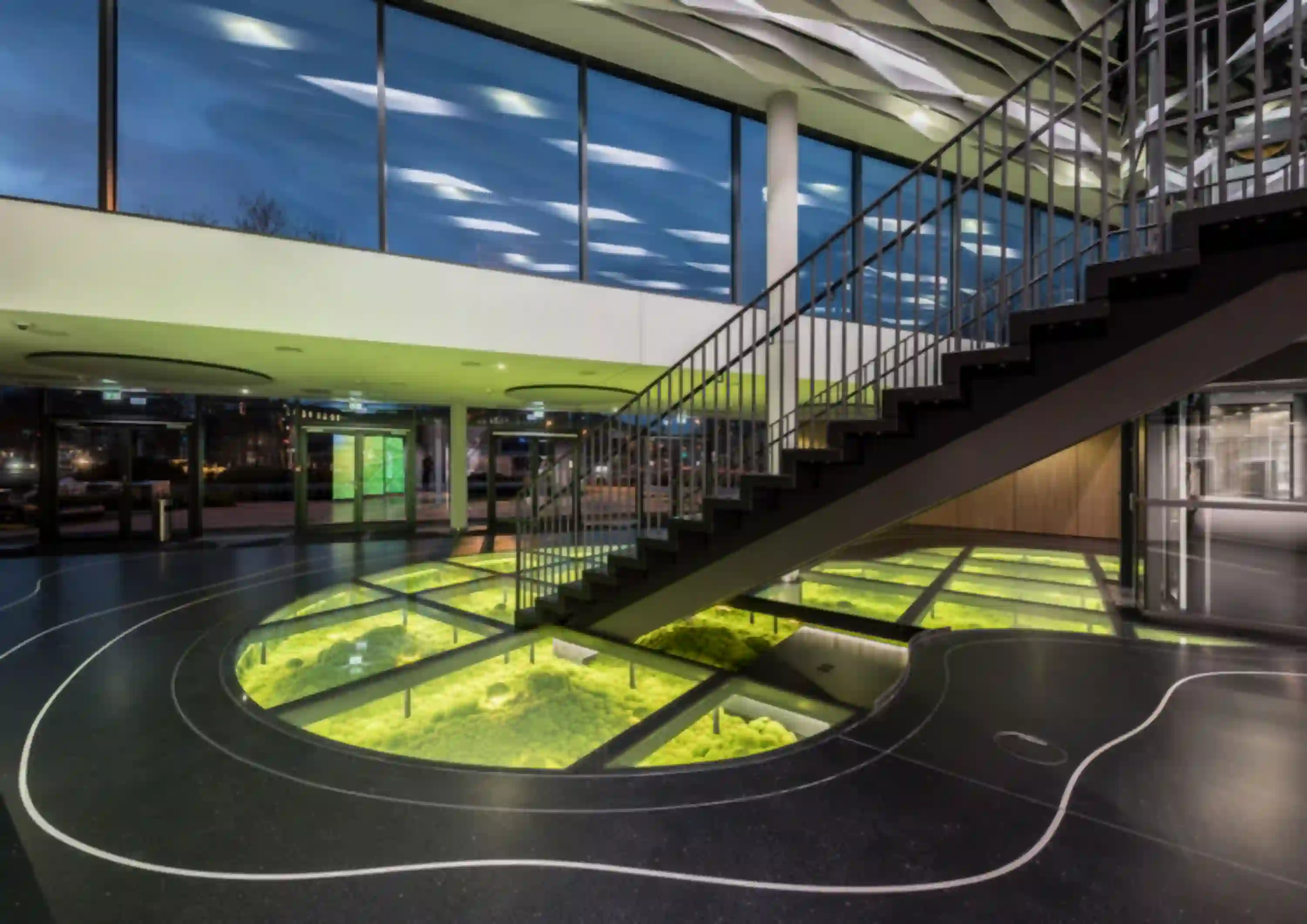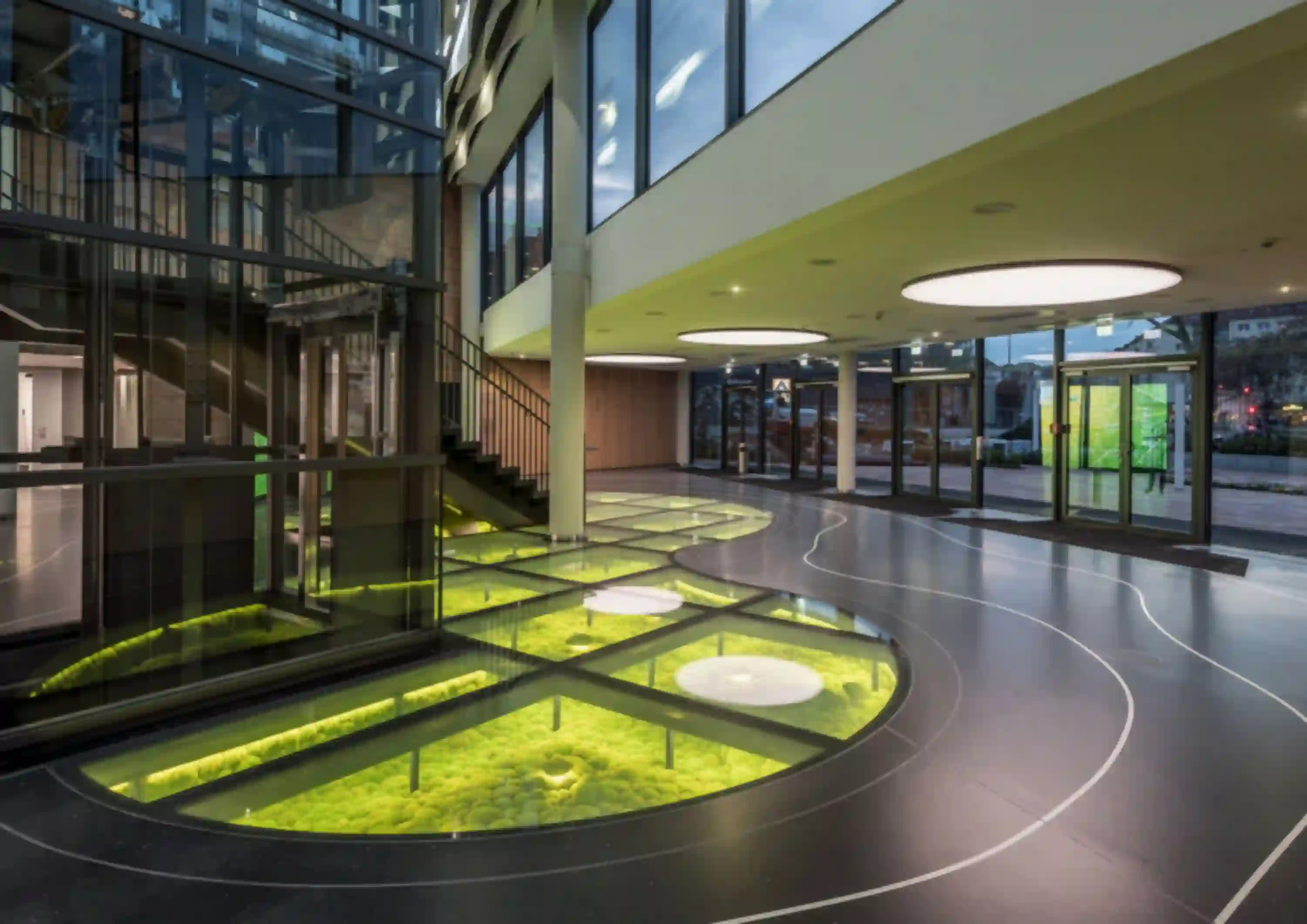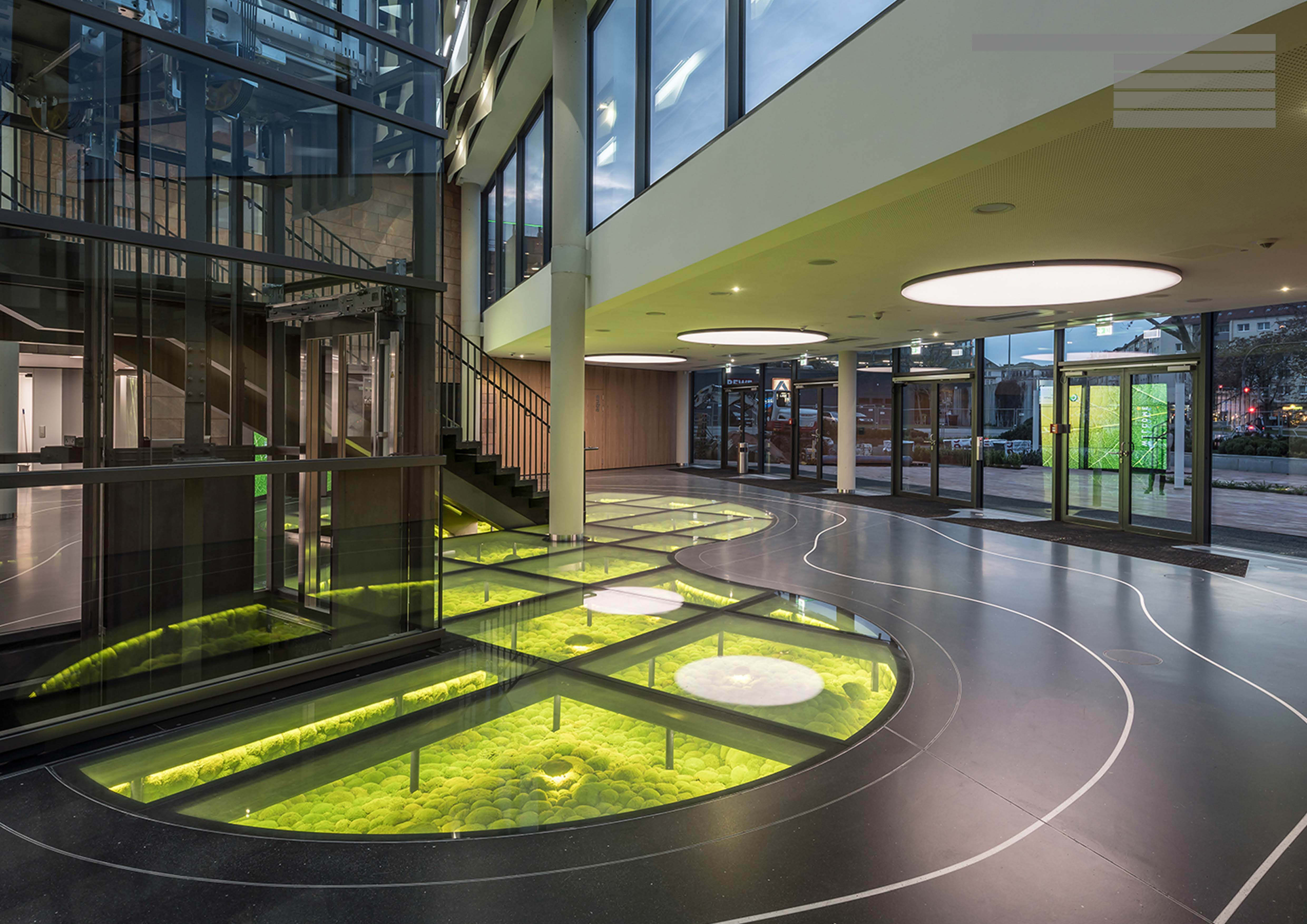 Unter dem nachhaltigen Leitgedanken „Metamorphose – Atmosphäre Natur im gebauten Raum erlebbar machen“ wurde schon beim Wettbewerb ein modernes Design mit weichen, fließenden Formen entwickelt, welches die vorhandenen markanten Sechsecke des denkmalgeschützten Gebäudes aus den 70er Jahren harmonisiert und ergänzt. Die Gestaltung lenkt den Blick auf die neue Nutzung und verbindet Tradition mit Innovation, ohne die historische Architektur zu verdrängen. Natürliche Materialien prägen das Konzept und holen die Vorzüge der Natur in den Innenraum. Der Höhepunkt der Gestaltung ist der begehbare Glasboden im Foyer: Unter dieser circa 65 m² großen, organisch geformten Glasfläche befindet sich mumifiziertes Kugelmoos, welches das Wiedererwachen des Lebens in einer Oase nach einem Vulkanausbruch symbolisiert.