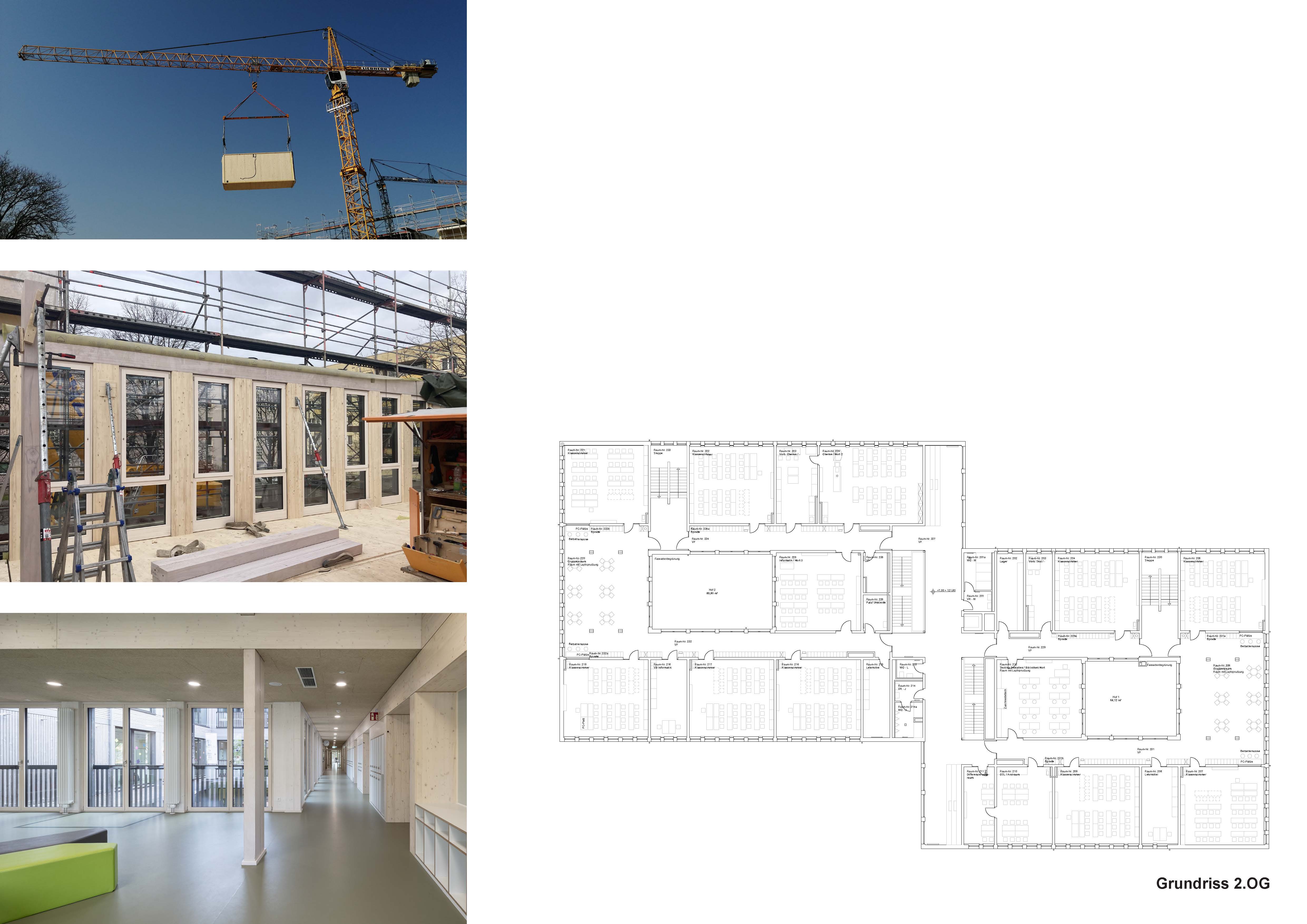 Das Schulgebäude ist in Holz-Modul-Bauweise errichtet, die eine serielle Vorfertigung und damit eine verkürzte Bauzeit ermöglicht (8 Monate ab OK Bodenplatte). Durch frühzeitige brandschutztechnische Optimierung der Planung konnte ein kostengünstiges Gebäude ohne größere Einschränkungen der Gestaltung und Nutzbarkeit errichtet werden. Der Neubau optimiert verschiedene Nachhaltigkeitsaspekte, wie den Verbleib von Abbruchmaterial als Baugrundverbesserung auf der Baustelle, die Bindung von Kohlendioxid im Baustoff Holz (2.000t) sowie die Fügung von Bauteilen ohne Verklebung. Theoretisch könnte das Gebäude sogar abgebaut und an einem anderen Ort wieder aufgebaut werden.