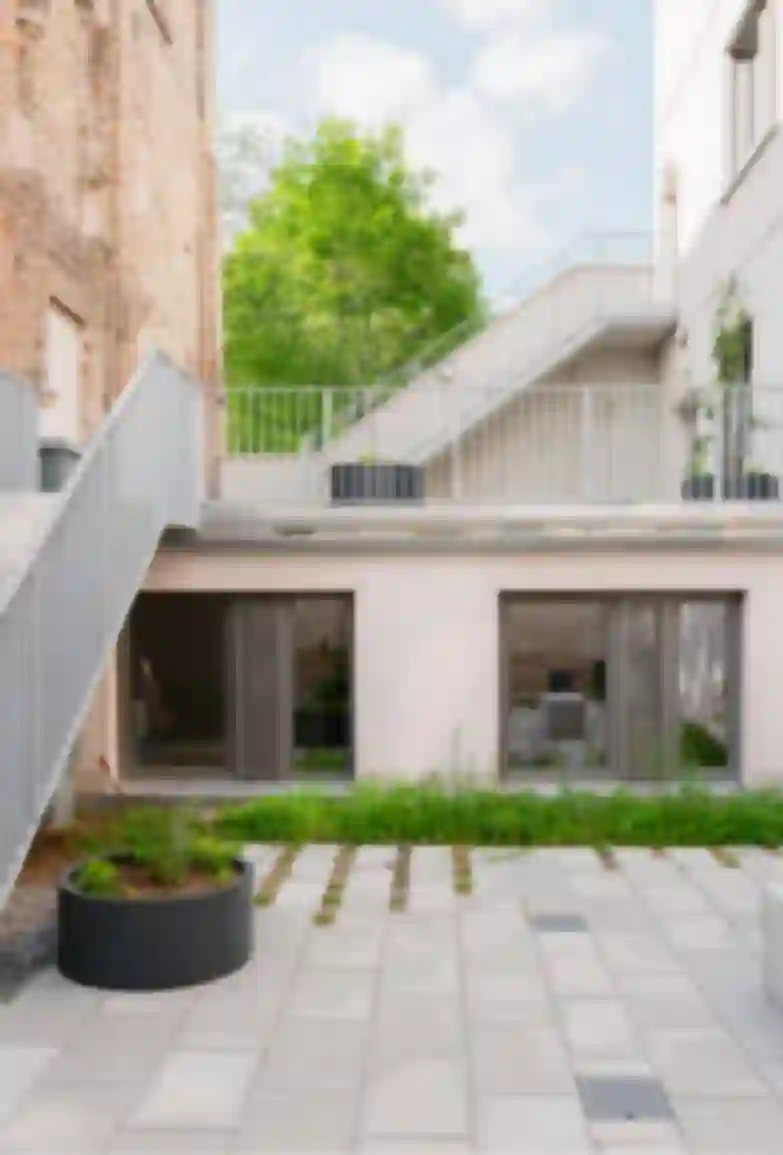 Das ursprünglich als Schokoladenfabrik genutzte Gebäude wurde 1921 errichtet und im Jahr 2023 als Integratives Familienzentrum umgenutzt. Das Gebäude ist nicht denkmalgeschützt - dennoch war bei der Sanierung, dem Umbau und der Erweiterung der Bestandserhalt und die -nutzung ein oberstes Ziel. Die Gestaltung des Gebäudes zeigt nun durch das Sichtbarmachen der verschiedenen Materialien die unterschiedlichen Zeitschichten. Das alte Mauerwerk und die neuen Baustoffe sind an vielen Stellen unverputzt oder geschlämmt, um die alten Gebäudeteile von den neuen unterscheiden zu können. Durch diese Art des Umbaus bleibt der Prozess des Wandels sichtbar und nachvollziehbar. Durch den Erhalt von einzelnen Gebäudeteilen, Mauerwerk und Fundamenten konnte ein nachhaltiger Umgang mit Rohstoffen bei der Sanierung und Erweiterung des Gebäudes gewährleistet werden.